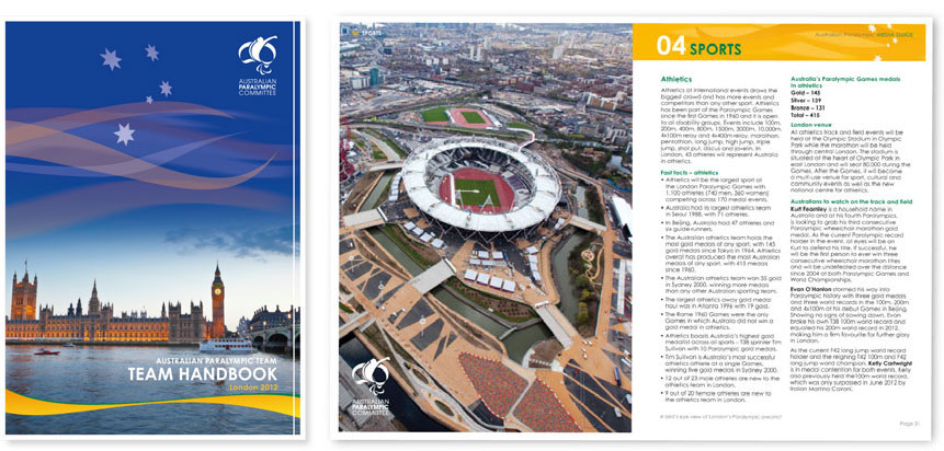 The work shown here is part of a suite of products developed for the London 2012 Paralympic Games. It provided a strong, clean look and uniform treatment that ran across the suite, while still adhering to the APC’s style guides.