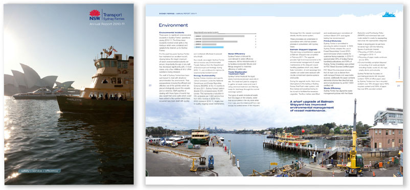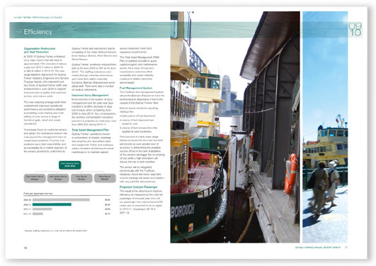 Clik designed and printed the last three Annual Reports for Sydney Ferries prior to its privatisation in 2012, including the award-winning report shown here.